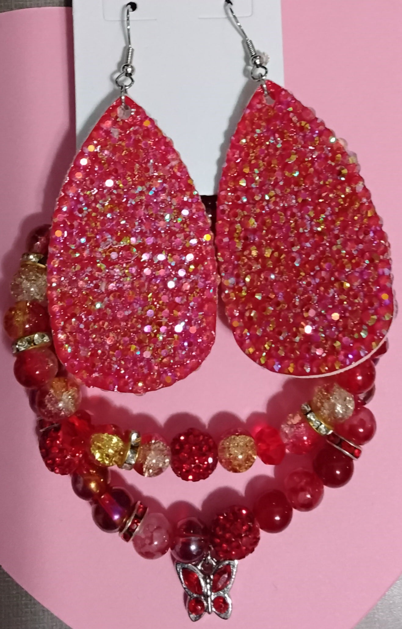 ❤️ Red Velvet Marble Rhinestone Bling Charm Bead Bracelet & Handmade Tear Drop Earring Set Makes a Great Gift for Women/ Fashion/ Birthday/ Everyday Wear